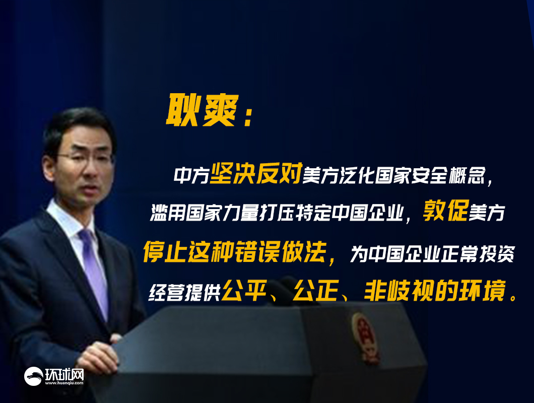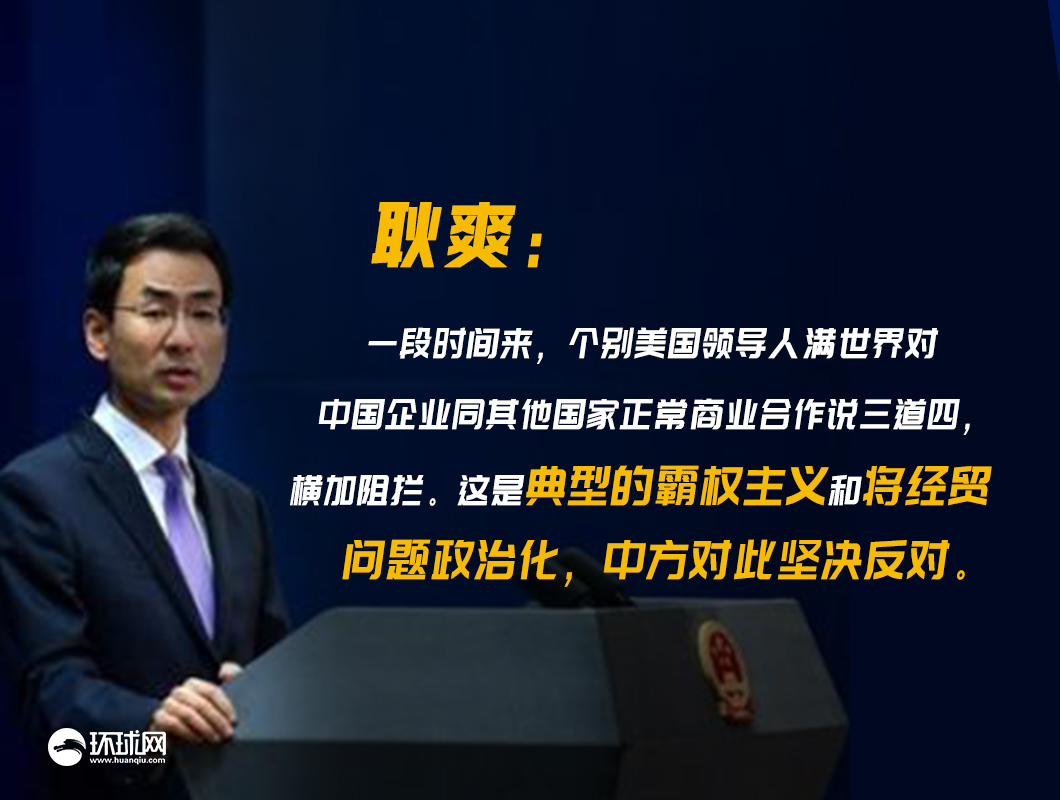 耿爽:一段时间来,个别美国领导人满世界对中国企业同其他国家正常商业合作说三道四,横加阻拦。这是典型的霸权主义和将经贸问题政治化,中方对此坚决反对。
