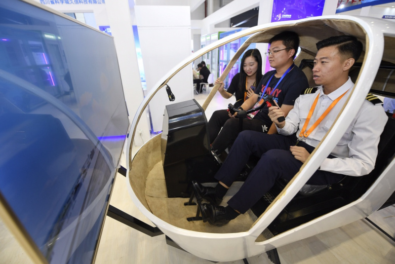 9月5日,观众在参展商(右一)的指导下体验飞行模拟器驾驶。